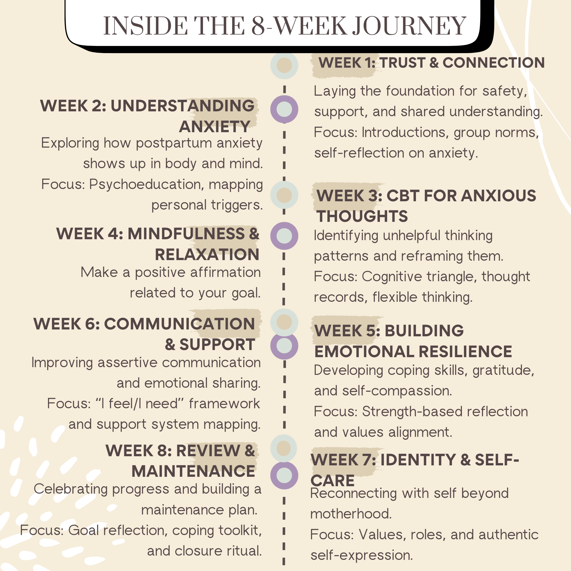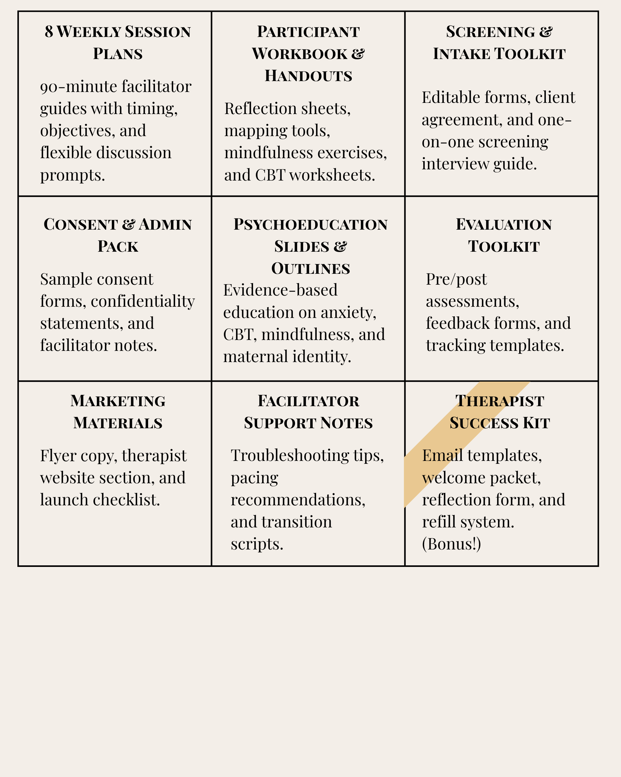 It’s a full, eight-week therapeutic experience—built by a perinatal specialist who knows exactly what new moms need and what therapists need to run a group with confidence and clinical integrity.